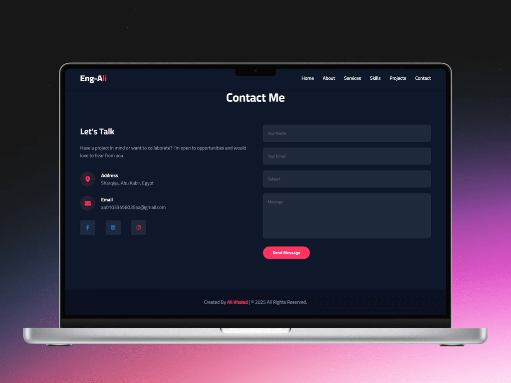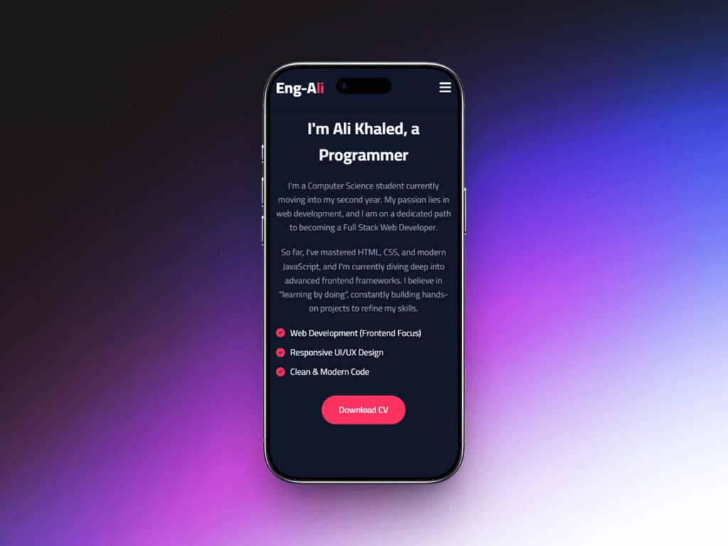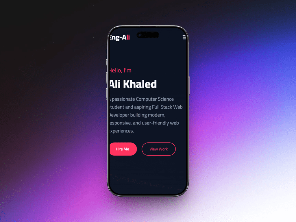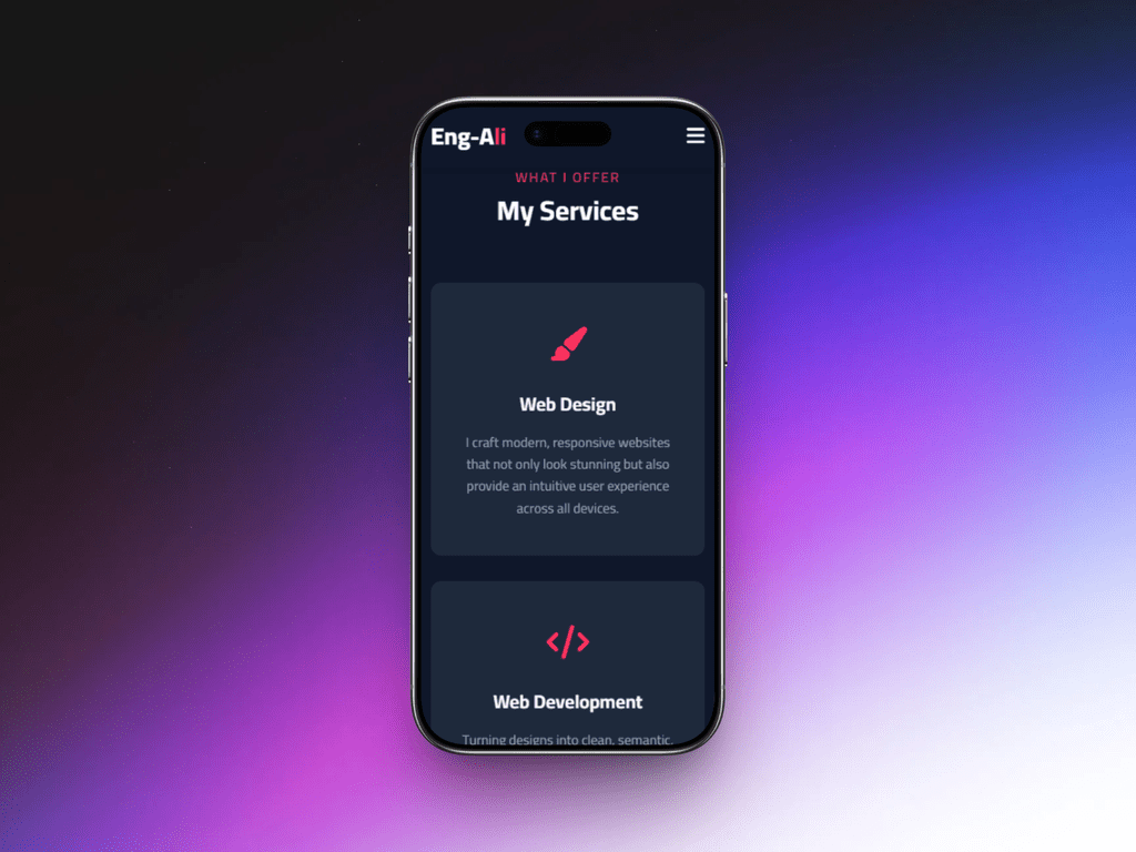 متميز في بناء تطبيقات الويب باستخدام مكتبة React ونسيقها باحترافية عبر Tailwind CSS. أركز دائماً على تقديم كود نظيف (Clean Code)، متوافق مع محركات البحث (SEO)، ومتجاوب تماماً مع جميع الشاشات (Responsive Design)، مع ضمان أفضل تجربة مستخدم ممكنة."