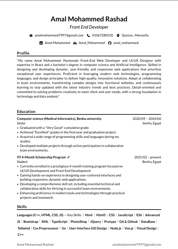 اسمي أمال محمد، مطورة واجهات أمامية شغوفة ومصممة UI/UX، أتمتع بخبرة في React وحاصلة على درجة البكاليوس في علوم الحاسوب والذكاء الاصطناعي. أتمتع بمهارات في تصميم وتطوير تطبيقات ويب ديناميكية، مستخدمة وسهلة الاستخدام، وتستجيب لاحتياجات المستخدمين، مع التركيز على تقديم تجارب مستخدم استثنائية. متمكنة في استغلال التقنيات الحديثة للويب، ولغات البرمجة، ومبادئ التصميم لتقديم حلول مبتكرة وعالية الجودة. قادرة على التعاون في بيئات العمل الجماعية، وتحويل التصاميم المعقدة إلى مواقع ويب وظيفية، وأتعلم باستمرار للبقاء على اطلاع بأحدث الاتجاهات والممارسات الأفضل في الصناعة. دقيقة في التفاصيل وملتزمة بحل المشكلات بشكل إبداعي لتلبية احتياجات العملاء والمستخدمين، ولدي أساس قوي في التكنولوجيا وتحليل البيانات.