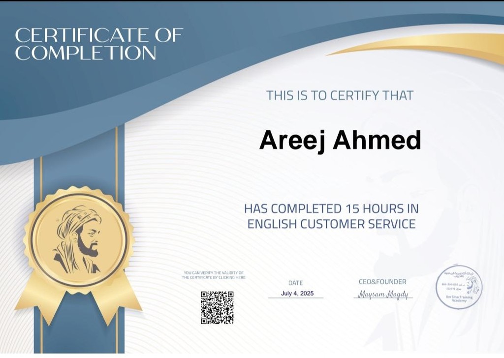 أمتلك خبرة في مجال خدمة العملاء، وأتميز بمهارات تواصل قوية والقدرة على التعامل مع مختلف أنواع العملاء باحترافية ولباقة. أحرص دائمًا على تقديم حلول فعّالة وسريعة، والعمل بروح الفريق، مع الالتزام بالجودة وتحقيق رضا العملاء. لدي قابلية عالية للتعلّم والتطوير المستمر وتحمل ضغط العمل.