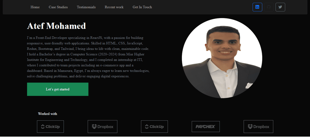 أنا عاطف محمد، مطوّر واجهات أمامية (Front-End Developer) متخصص في تطوير مواقع وتطبيقات الويب باستخدام ReactJS وJavaScript وأُتقن بناء واجهات تفاعلية وسريعة الاستجابة تتوافق مع جميع الأجهزة.