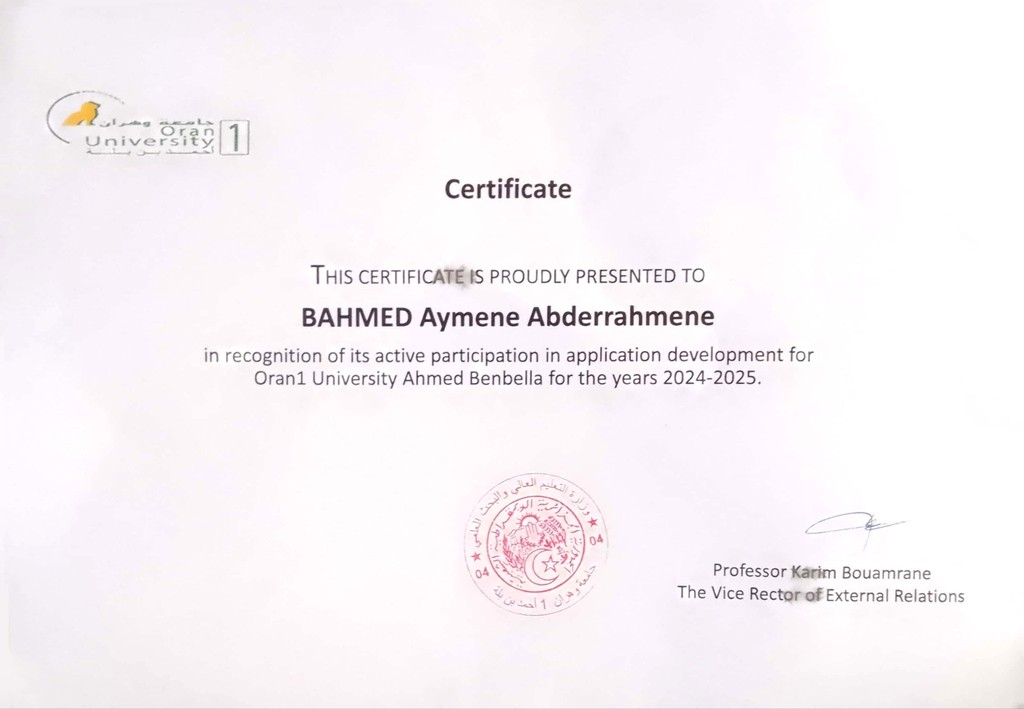 متحصل على شهادة إنهاء مرحلة بكالوريوس في جامعة وهران 1 أحمد بن بلة والتي مدتها 3 سنوات، تخصص علوم الحاسوب.