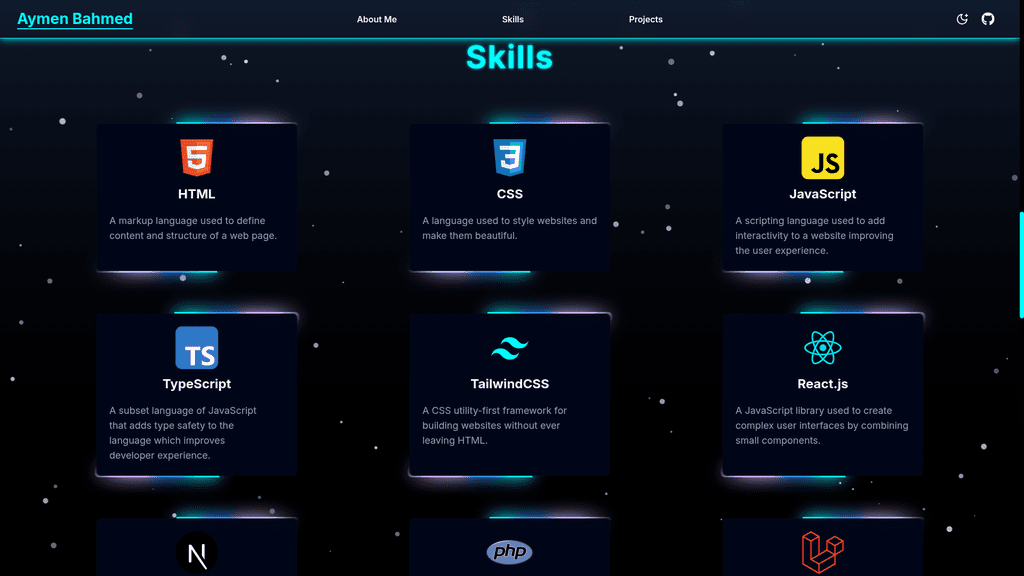 HTML, CSS, JavaScript, TypeScript, TailwindCSS, React.js, Next.js, PHP, Laravel, PostgreSQL, Git, Github