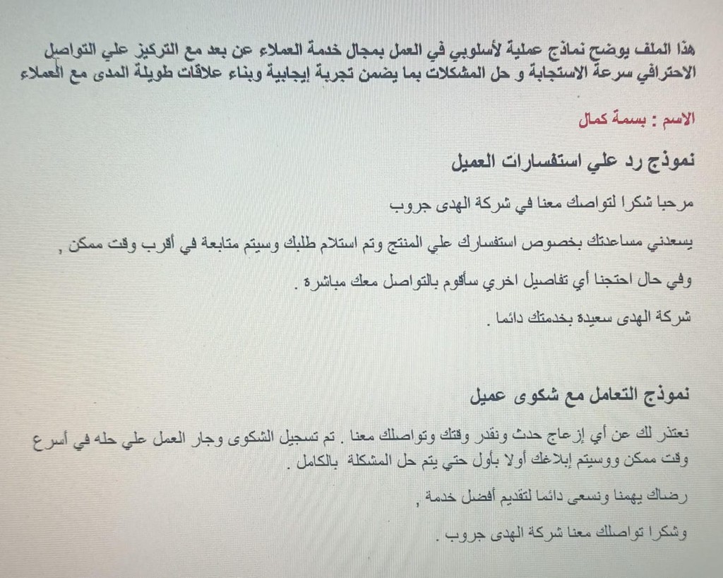 التعامل مع استفسارات العملاء وحل المشكلات مع الحرص علي تقديم تجربة إيجابية وبناء علاقات المدى مع العملاء و الالتزام بجودة الخدمة وسرعة الأستجابة.