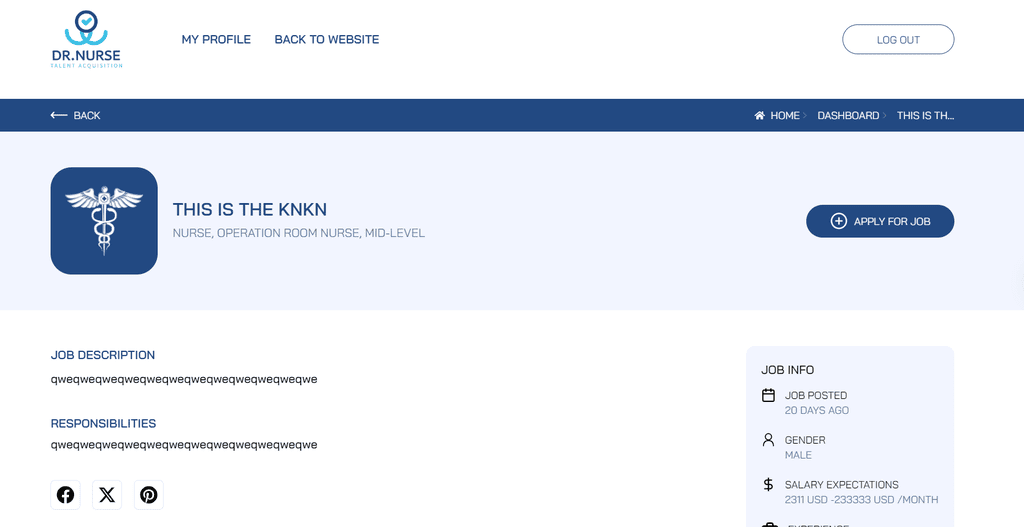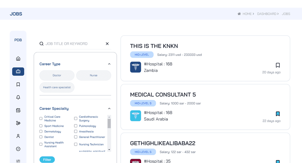 برمجه api لتطبيق وموقع الكتروني يمكن المراكز الصحيه من اضافه وظائف في المجال الطبي و يسمح للباحثين عن وظيفه من عرض الواظائف والتقديم عليه مع ارسال اشعارات بالوظائف المناسبة وامكانيه الفلتره بالبلد والمدينه ونوع الوظيفه