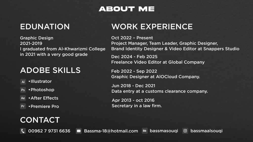 مرحبًا، أنا بسمة – مصممة جرافيك محترفة بخبرة تفوق 5 سنوات في التصميم الإبداعي.