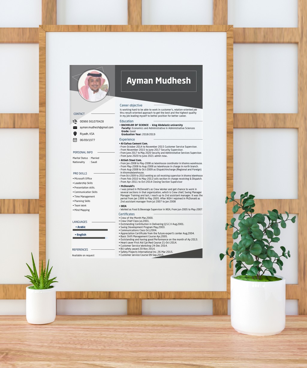 أقدم محتوى راقي وجذاب للسيرة الذاتية جاهز للطباعة CMYK باللغة العربية أو بالإنجليزية بصيغة jpg و pdf مع تسليم الملف المصدري بصيغة PSD أو AI بعد اتمام العمل للتمكن من التعديل عليه في أي وقت.