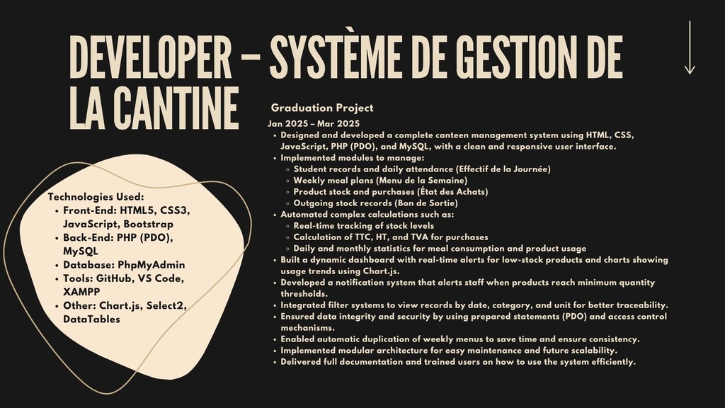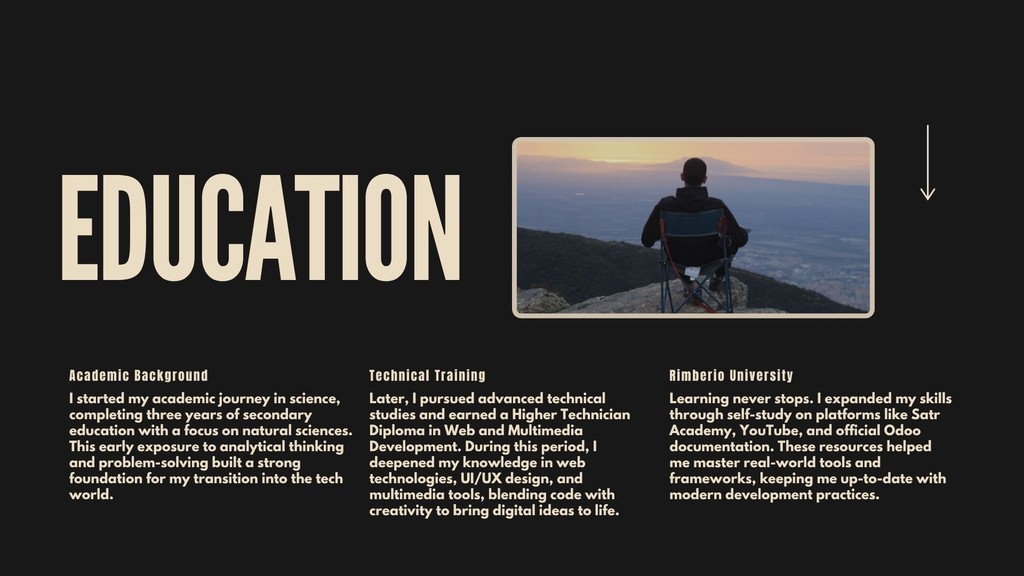 دراسة معمّقة في تطوير تطبيقات الويب، البرمجة بلغة PHP وJavaScript، تصميم قواعد البيانات بـ MySQL، بالإضافة إلى التدريب الميداني في مؤسسات حقيقية.
