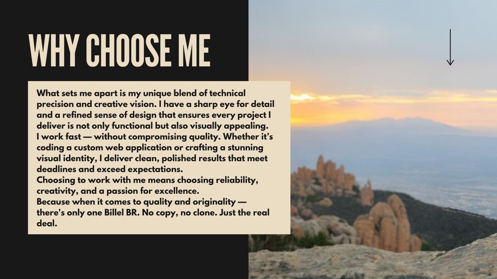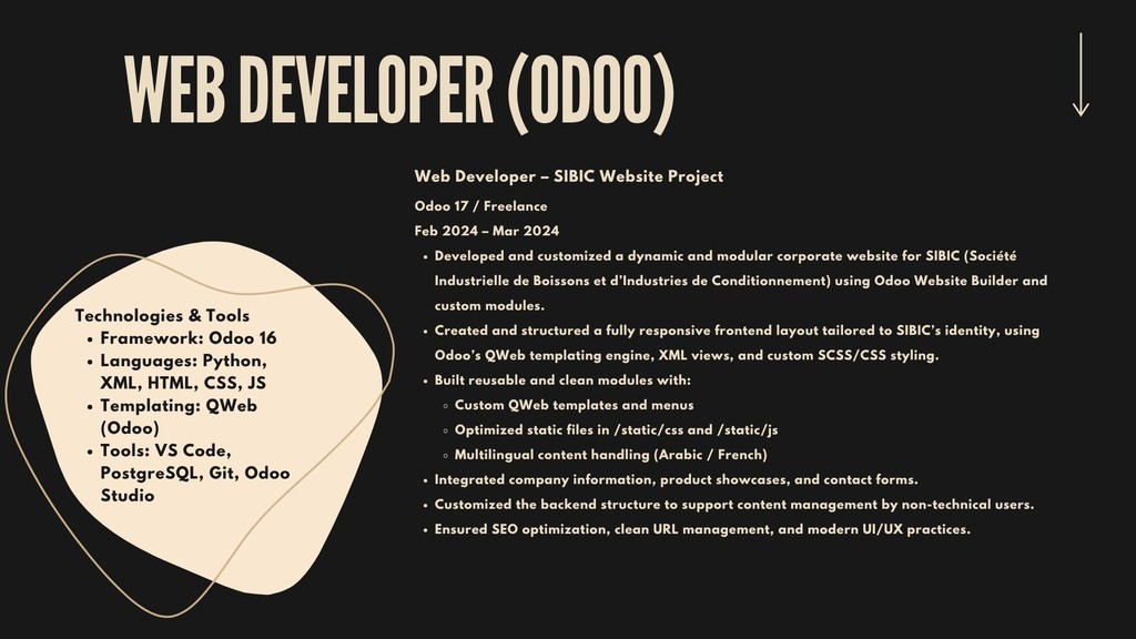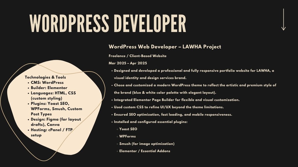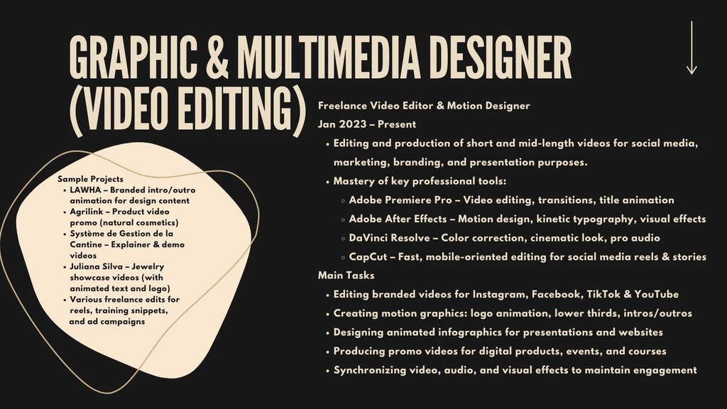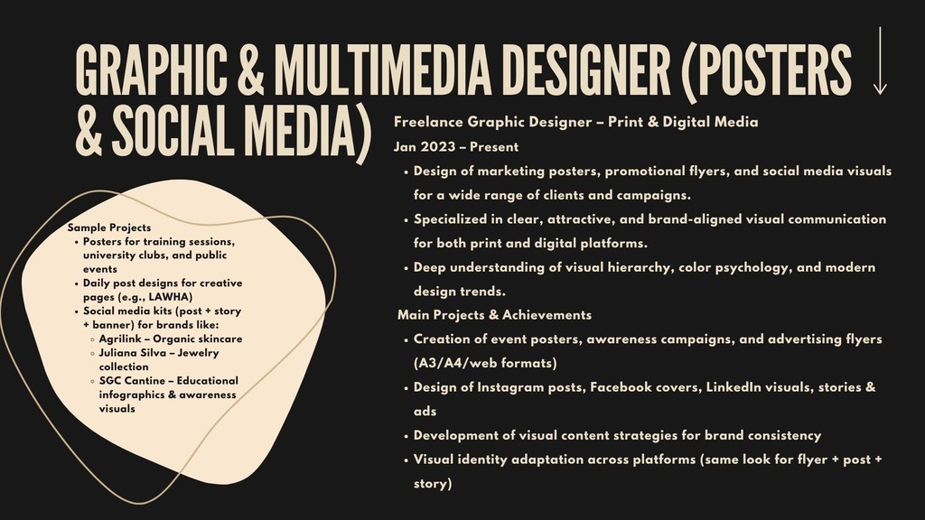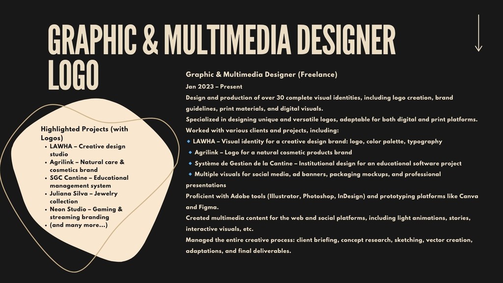 أتميز بالقدرة على تحويل الأفكار إلى مشاريع رقمية متكاملة، سواء من خلال تطوير مواقع ويب ديناميكية أو تصميم هويات بصرية وإعلانات احترافية. أسعى دائمًا لتقديم حلول إبداعية ومبتكرة تلبي احتياجات العملاء وتعكس رؤيتهم بأفضل صورة