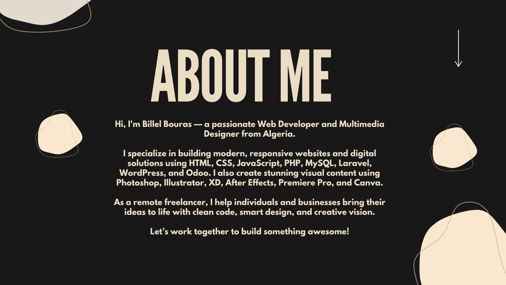 أنا بلال بوراس، مطور ويب ومصمم جرافيك بمستوى تقني سامي، أمتلك خبرة في تصميم وتطوير المواقع باستخدام HTML, CSS, JavaScript, PHP, SQL، بالإضافة إلى إتقان مجموعة Adobe للتصميم والمونتاج، بما في ذلك Photoshop, Illustrator, Premiere Pro, After Effects.