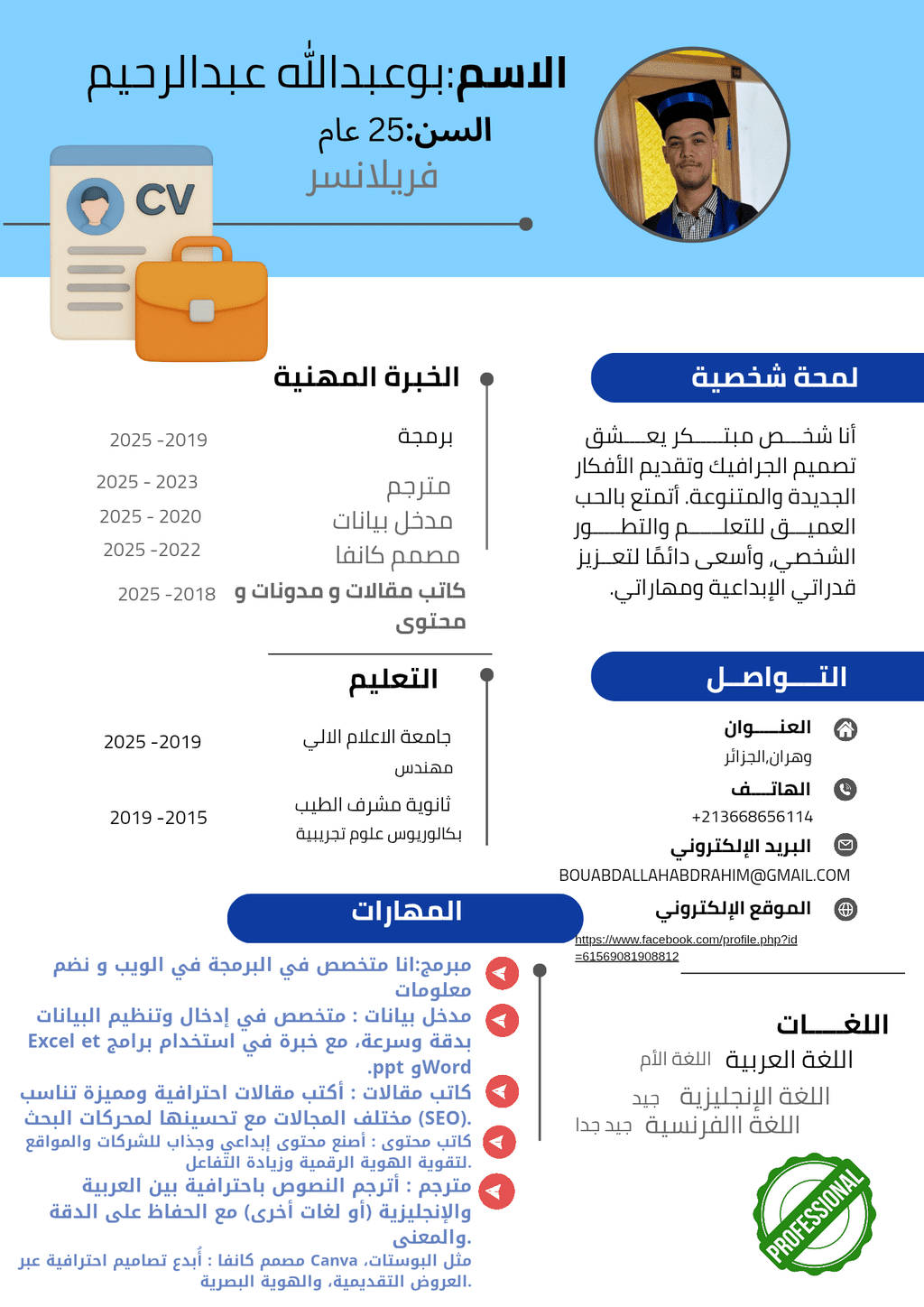أنا بوعبدالله عبد الرحيم، شاب جزائري طموح يبلغ من العمر 25 سنة، أعمل فريلانسر بخبرة متنوعة في البرمجة و خبير في الذكاء الاصطناعي ، الترجمة، إدخال البيانات، تصميم الجرافيك، وكتابة المحتوى. أتميز بالابتكار والدقة في العمل، وأسعى دومًا لتطوير مهاراتي ومواكبة كل جديد في مجالات التقنية والتصميم. أحب تحويل الأفكار إلى مشاريع ملموسة تضيف قيمة حقيقية، سواء في البرمجة أو في كتابة المحتوى الإبداعي المتوافق مع محركات البحث. أتقن العربية والإنجليزية وأجيد الفرنسية بدرجة ممتازة، مما يساعدني على العمل باحترافية مع عملاء من خلفيات مختلفة.