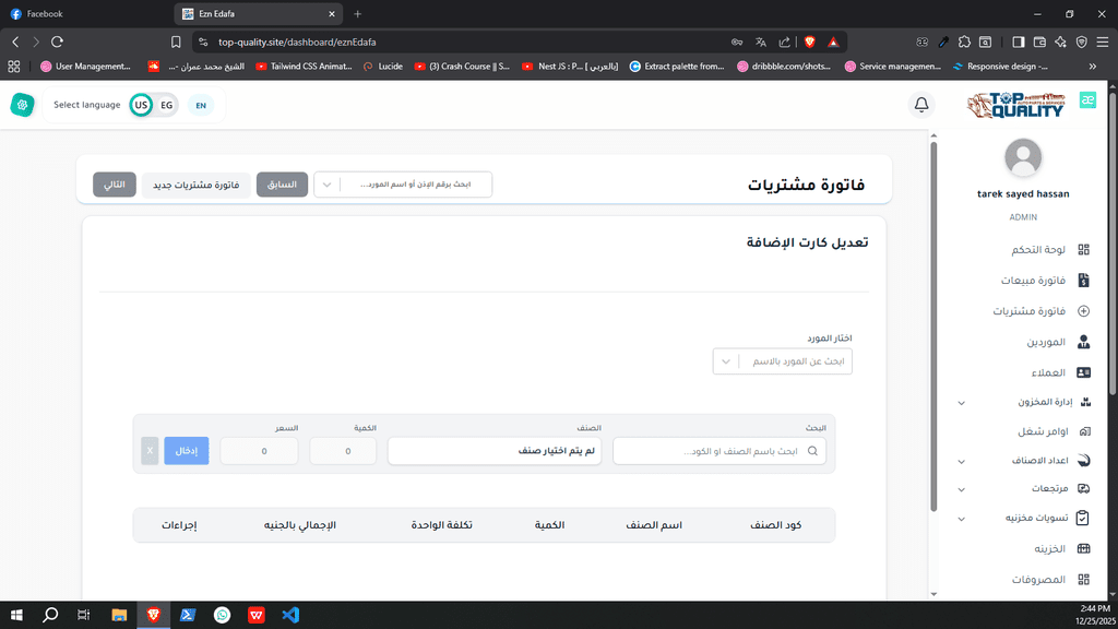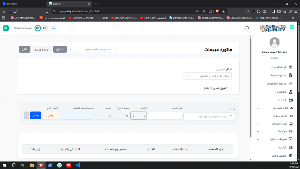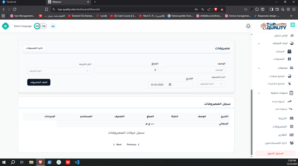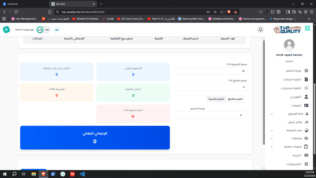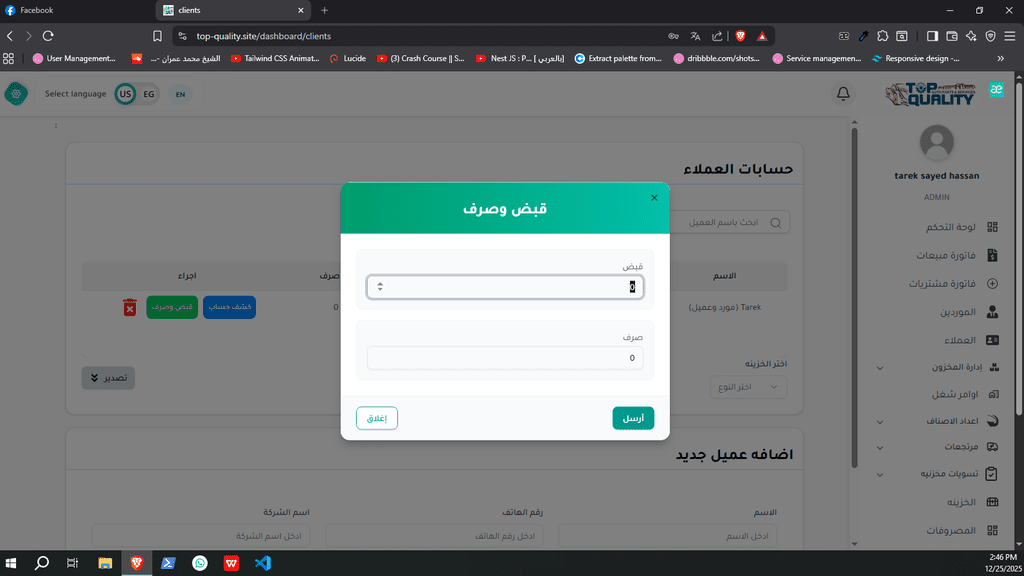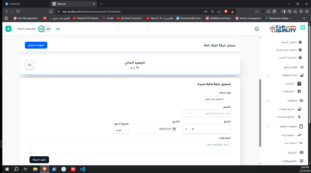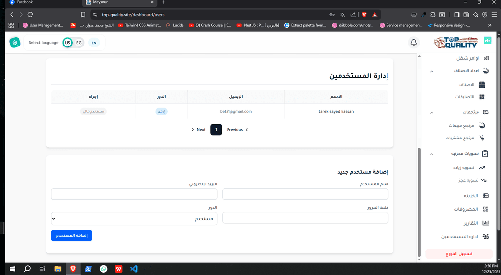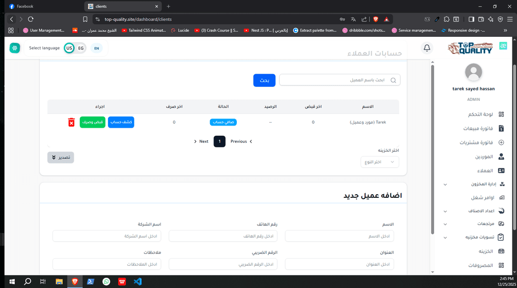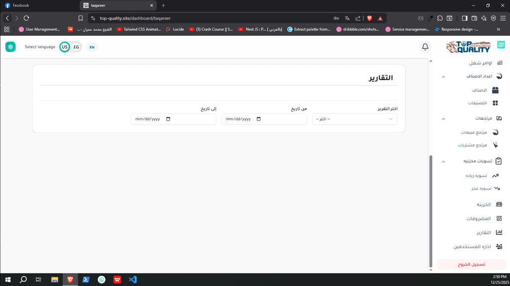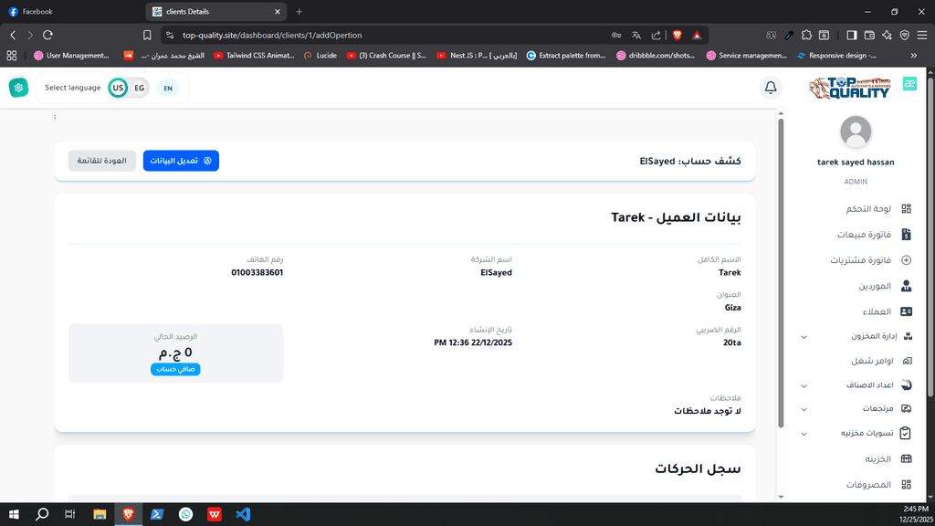 نظام ERP كامل تم تصميمه وتنفيذه من الصفر لشركة Top Quality، يشمل إدارة المستخدمين، الصلاحيات، العمليات، والتقارير.