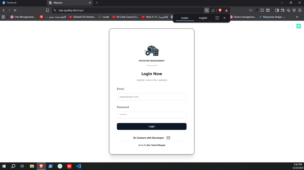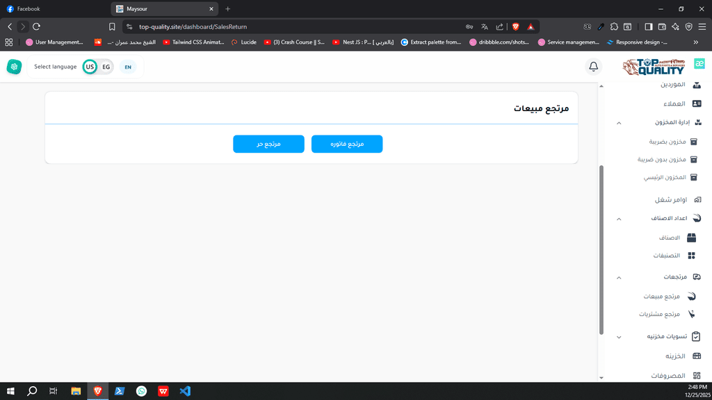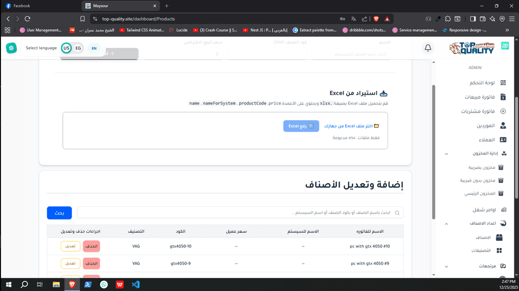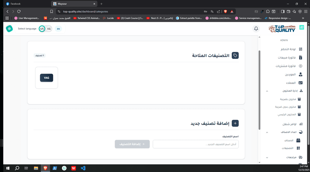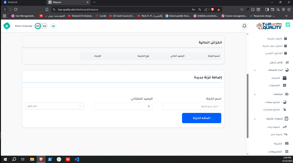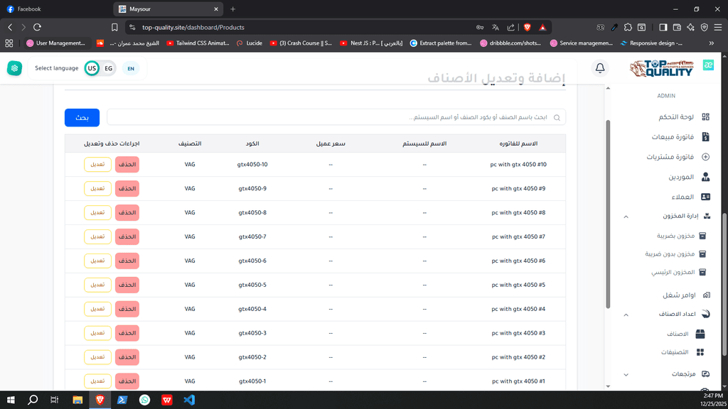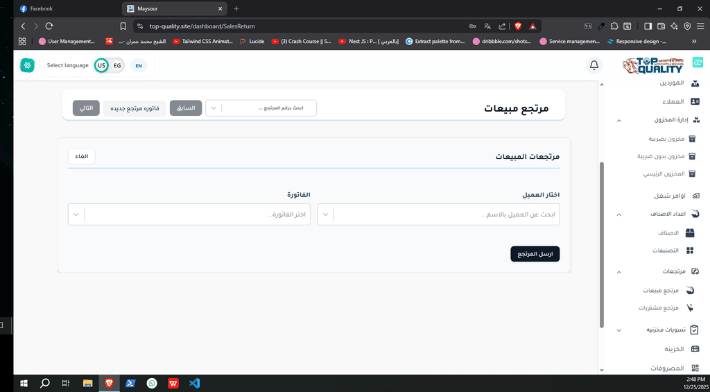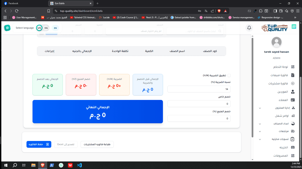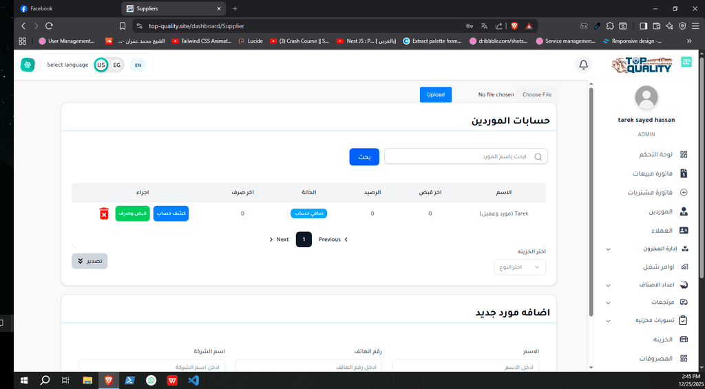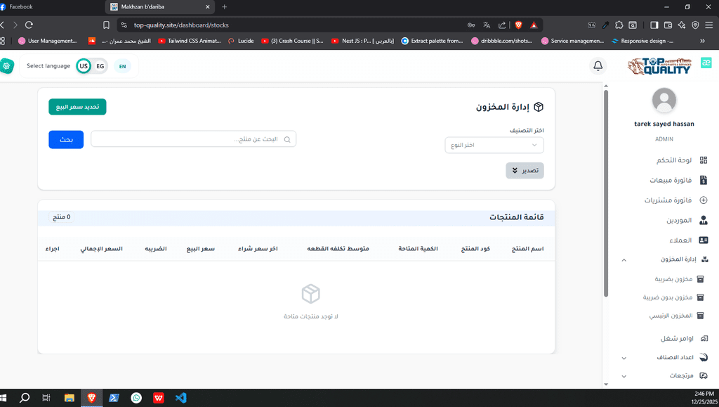 نظام ERP كامل تم تصميمه وتنفيذه من الصفر لشركة Top Quality، يشمل إدارة المستخدمين، الصلاحيات، العمليات، والتقارير.