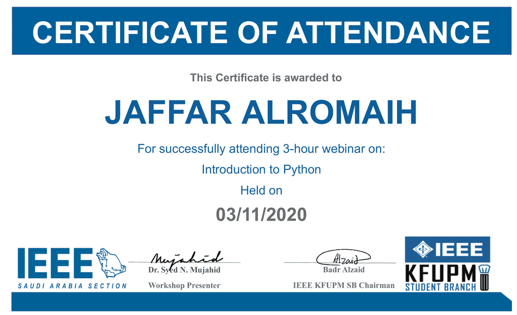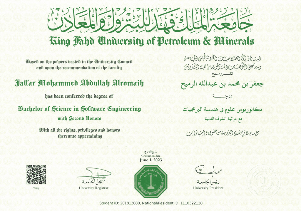 مهندس برمجيات مسجل رسميًا في وزارة الموارد البشرية والتنمية الاجتماعية. حاصل على شهادة البكالوريوس من جامعة الملك فهد للبترول والمعادن (KFUPM) في هندسة البرمجيات بمرتبة الشرف الثانية وتخصص دقيق في الشبكات وعضوية مهندس من الهيئة السعودية للمهندسين.