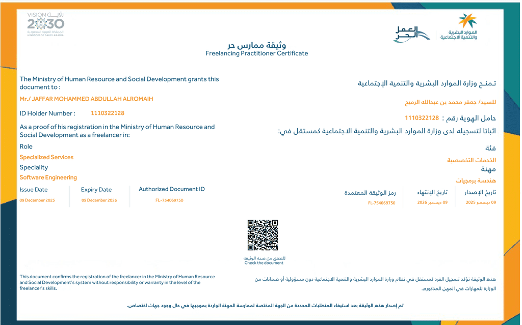 I am a registered Software Engineering freelancer with the Ministry of Human Resource and Social Development. I hold a BSc from KFUPM with Second Honors, a concentration in Computer Networks, and I am an SCE-certified engineer.