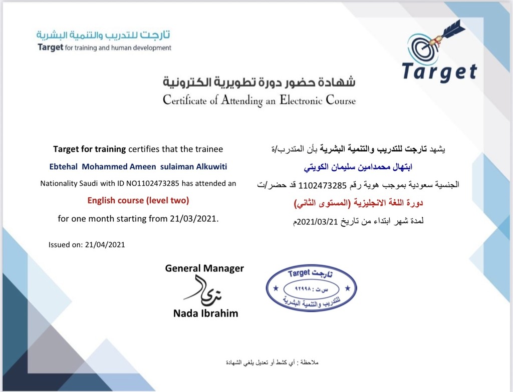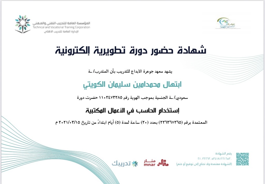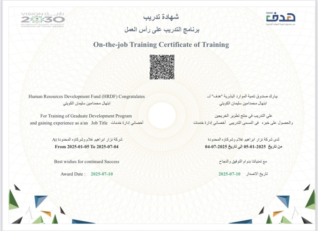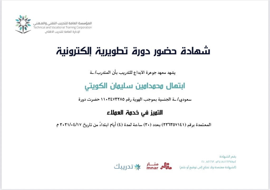 إكمال تدريب لمدة 7 اشهر لدى تمهير بمسمى اخصائي إدارة خدمات واستلام شهادة الخبرة من تمهير وشهادة الشكر