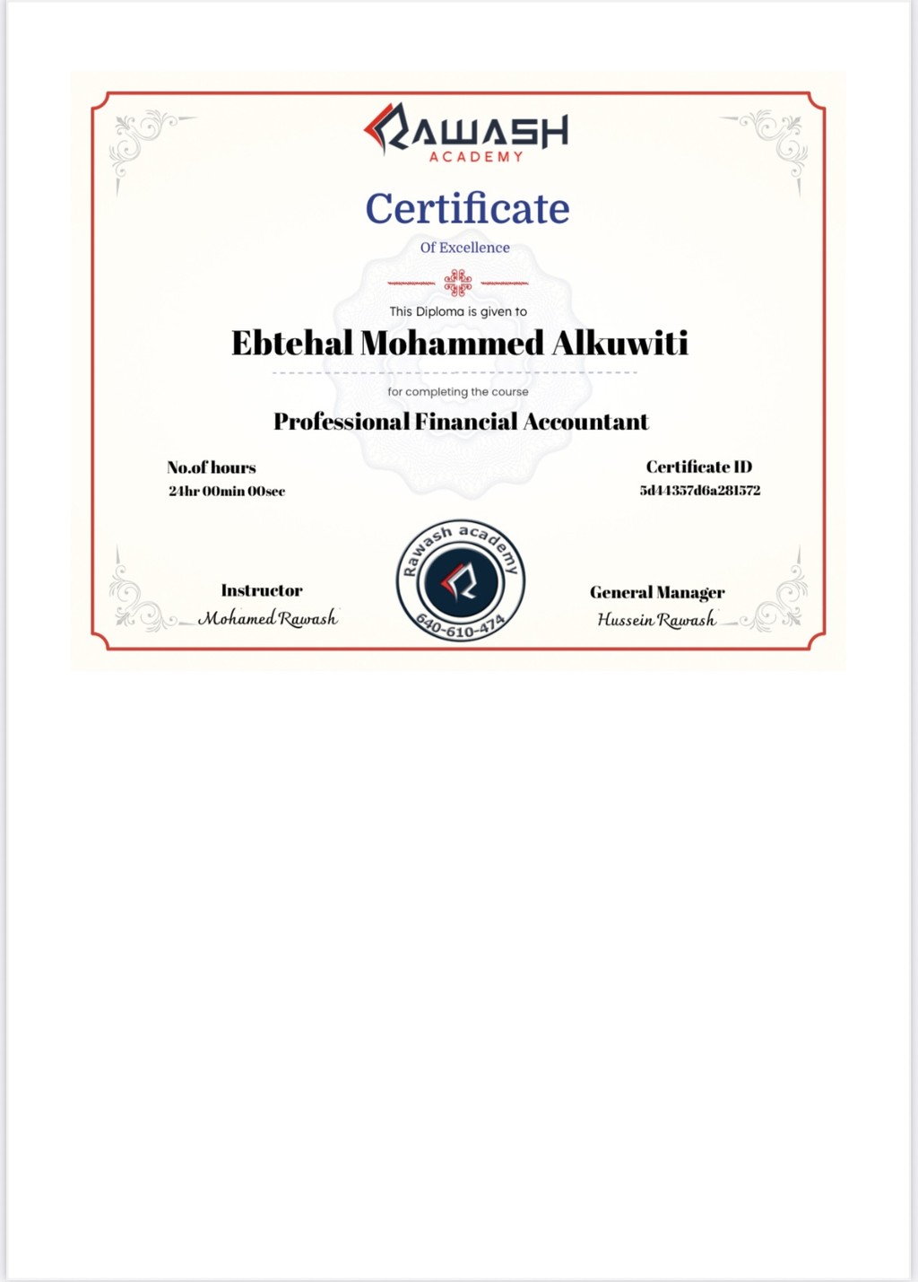اتمام مهارات دورة المحاسبة بكل تفاصيلها في ٣ اشهر وبكل مايختص ببرنامج الاكسل من اكادمية رواش