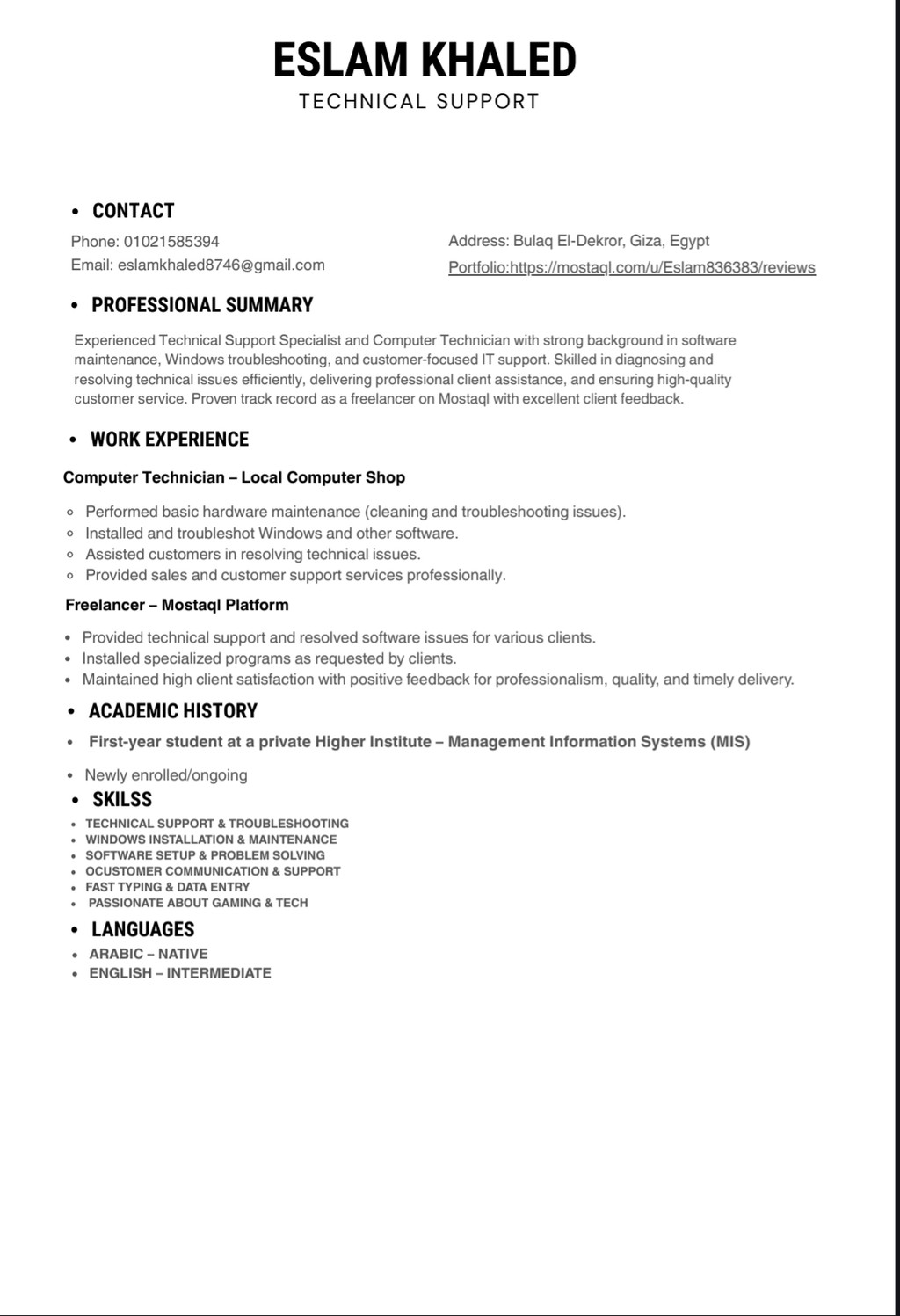 خبرة تزيد عن 4 سنوات في التعامل مع أعطال الحاسب الآلي والهواتف الذكية، وتشخيص وحل المشكلات التقنية المتنوعة (Hardware & Software).