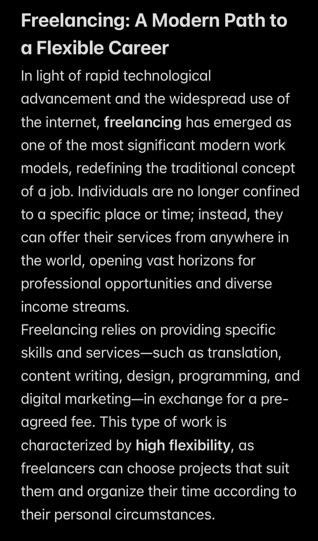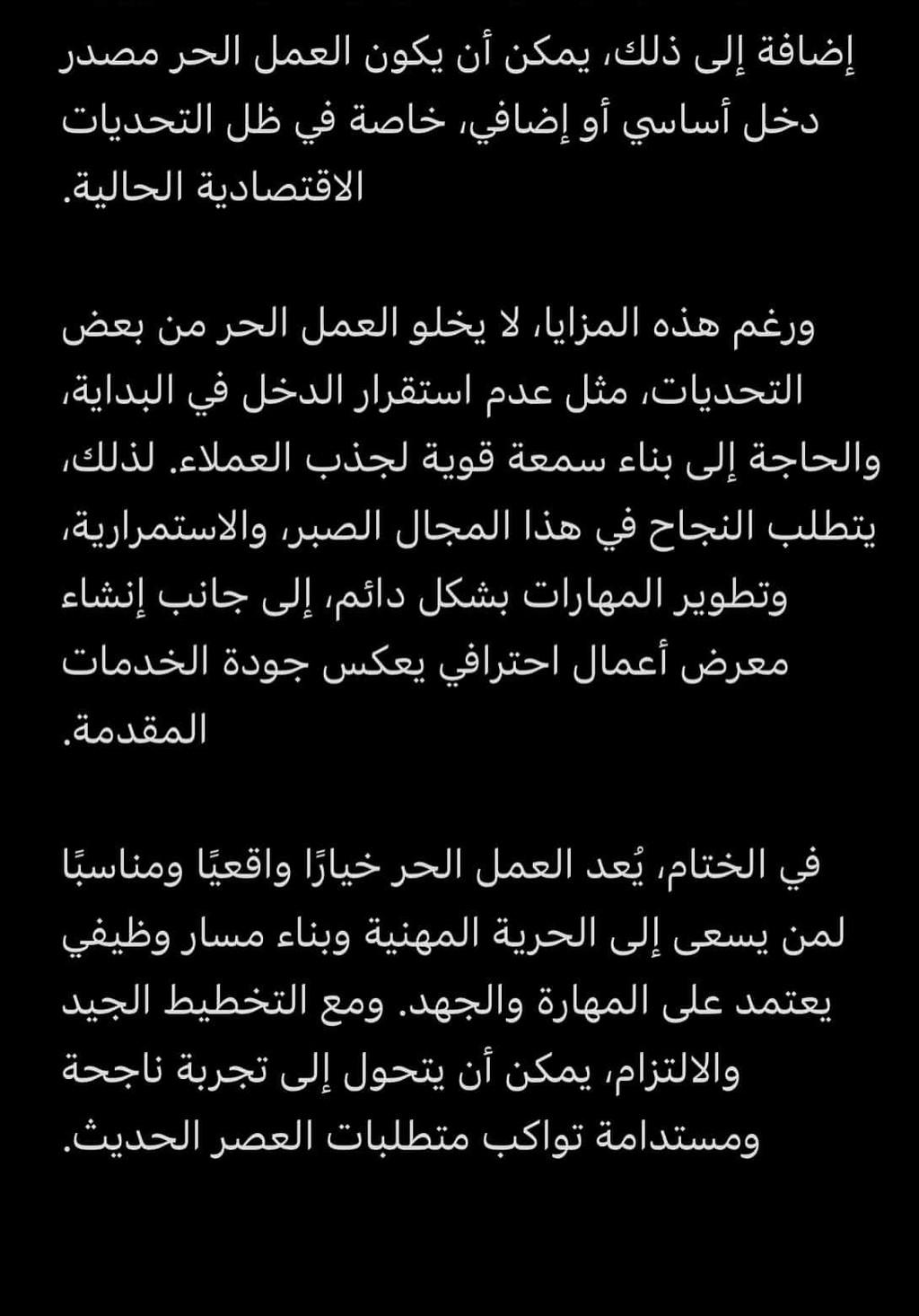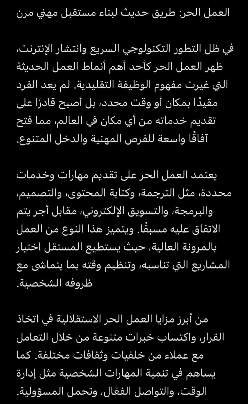 إعداد محتوى مكتوب واضح وجذاب لموضوعات مختلفة، مع الاهتمام بالأسلوب، التنظيم، وقوة الفكرة، والالتزام بالمواعيد النهائية.