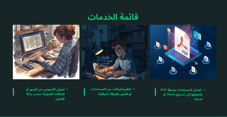 تفريغ محتوى من الصوت والفيديو إلى نصوص دقيقة، بالإضافة إلى الترجمة بين العربية والإنجليزية باحترافية.