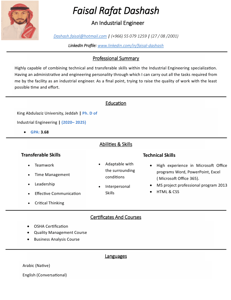 أتمتع بشخصية إدارية وهندسية تُمكّنني من تنفيذ جميع المهام المطلوبة مني من قِبل المنشأة كمهندس صناعي. وأخيرًا، أسعى جاهدًا لرفع جودة العمل بأقل جهد ووقت ممكنين.