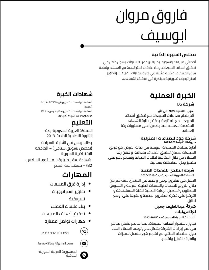 بفضل من الله منذ عام 2016 انضممت لسوق العمل السعودي في شركة عبد اللطيف للأكترونيات و ثم الى شركة النهدي للمعدات الطبية ثم الى العديد من الشركات السورية مثل شركة جود للصناعات المنزلية و شركة الكريم التجارية الى ان اكتسبت خبرة عميقة في فهم سوق العمل و التواصل الفعال مع الزبون و التنسيق مع جميع اطراف عملية البيع للوصول الى النتيجة المطلوبة بأقل جهد ممكن و أعلى جودة مع إدارة مرنة و احترافية لفريق العمل بالأضافة الى إدارة خدمات ما بعد البيع و متابعة مستمرة لخدمات ما بعد البيع.