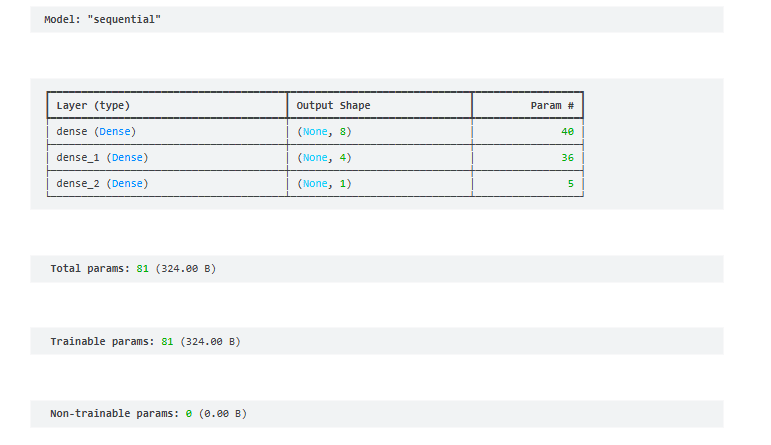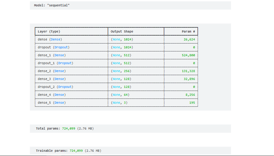 * بناء النموذج: تم بناء نموذج شبكة عصبية باستخدام Keras يتكون من طبقات متعددة ووظائف تفعيل، وتم تدريبه على البيانات المعالجة.
