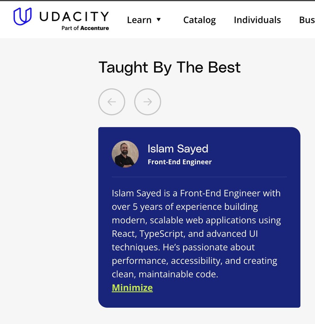 Beyond my professional work, I am committed to sharing knowledge and empowering other developers. I created and authored a Udacity course on optimizing GitHub profiles, helping students around the world showcase their technical skills and stand out to employers. In addition, I served as a Udacity mentor for over two years, where I guided hundreds of students through the Front End Nanodegree, conducted monthly webinars, and provided hands-on support to aspiring engineers. I also regularly publish tutorials and articles on platforms like Medium and Dev.to, covering front end best practices, accessibility, and modern JavaScript.