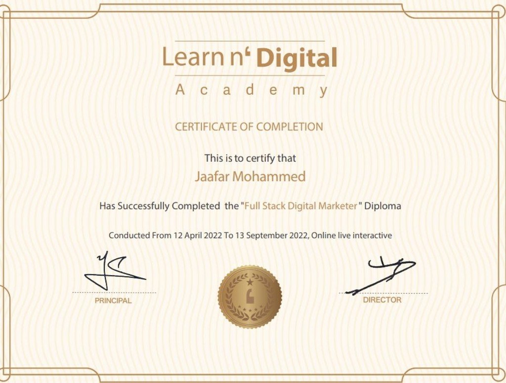 في عام 2022 أكملت 124 ساعة تدريبية ضمن دبلوم Full-Stack Digital Marketer مع مؤسسة Learn n' Digital، وتضمّن البرنامج مسارات: إدارة وسائل التواصل الاجتماعي، صناعة المحتوى، إعلانات السوشيال ميديا، تحسين محركات البحث (SEO)، وإعلانات Google، بالإضافة إلى ورشة عمل متخصصة في التسويق عبر البريد الإلكتروني، مما عزز مهاراتي الشاملة في مختلف جوانب التسويق الرقمي.