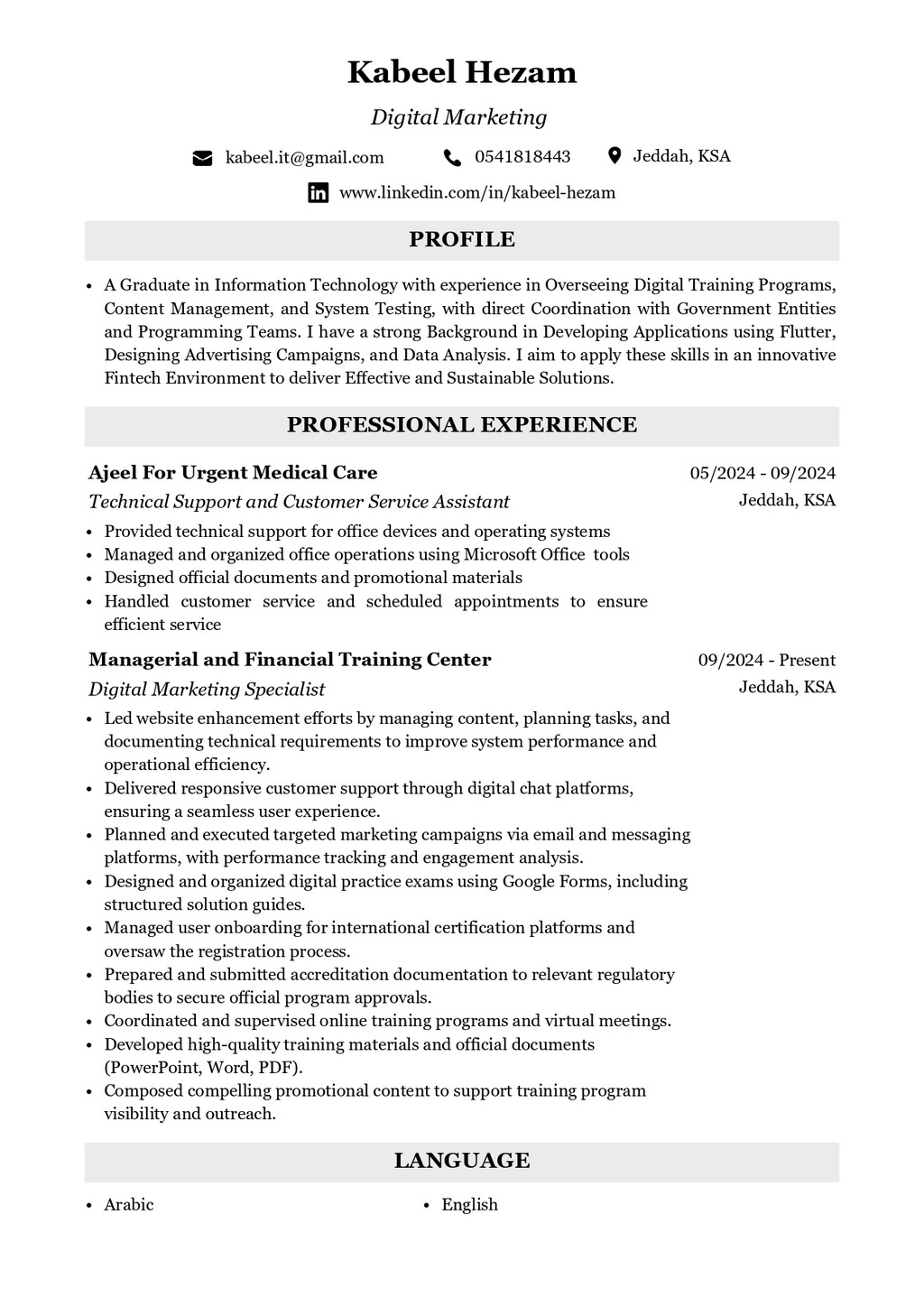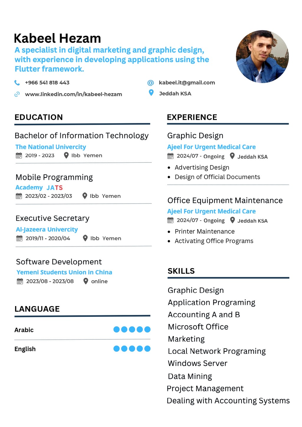 حاصل على درجة البكالوريوس في تقنية المعلومات مع خبرة لأكثر من عامين في ادارة الحملات الاعلانية واعداد المحتوى والتصميم الجرافيكي وادارة المنصات التعليمية مع خلفية جيدة في برمجة التطبيقات باستخدام لغة Flutter.