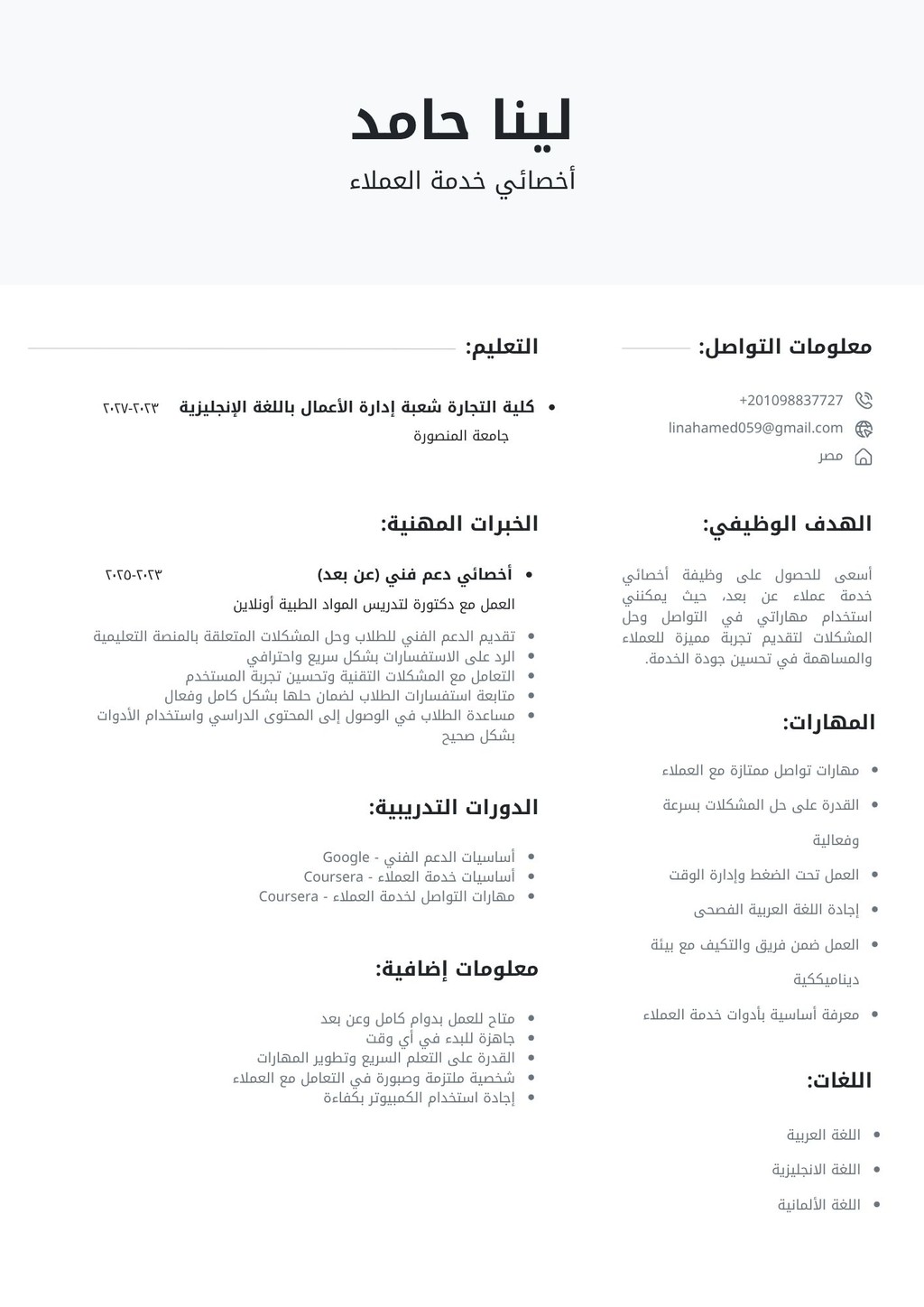 معكم لينا، أخصائية دعم فني وخدمة عملاء بخبرة في إدارة استفسارات المستخدمين وحل المشكلات بسرعة واحترافية. أتمتع بمهارات تواصل قوية وقدرة على تقديم تجربة مميزة للعملاء وضمان رضاهم.