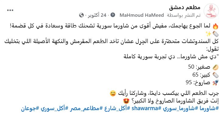 كتابة بوست تسويقي وعمل تصميم مناسب له يشمل أحجام السندوتشات المتاحة مع صورة لسندوتش بطريقة أحترافية.