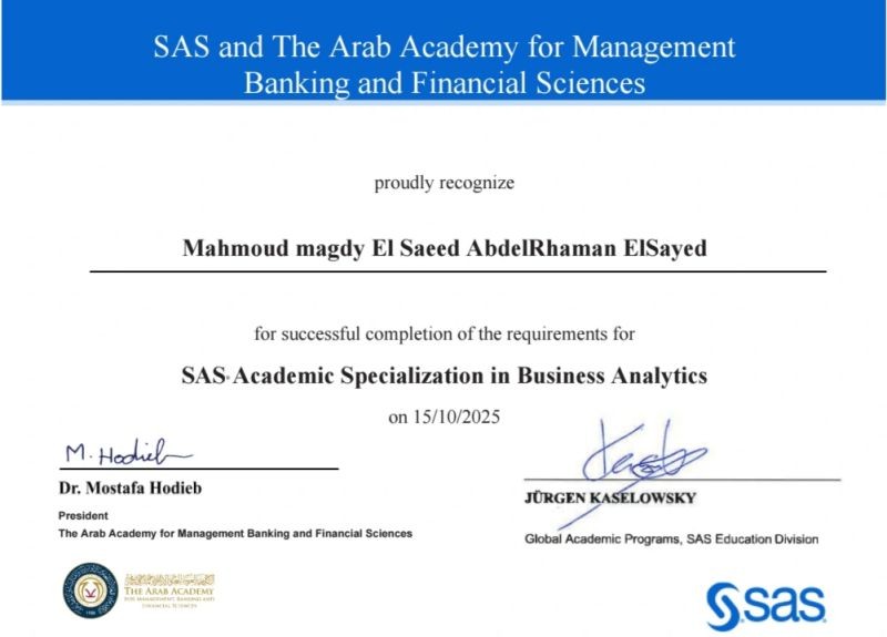 أنا محمود مجدي السعيد، محلل مالي ومصرفي متخصص في إدارة مخاطر الائتمان والتحليل المالي وتحليل البيانات، بخبرة قوية في القطاع البنكي والمالي.