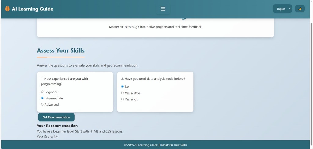 :تطوير واجهة مستخدم (Interface) لموقع "AI Learning Guide" يتضمن أداة تقييم مهارات ذكية (Skills Assessment).