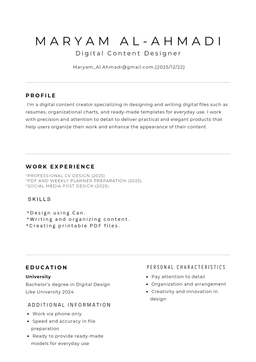 أنا مروة، مستقلة في خدمة العملاء وتصميم المطبوعات. أمتلك خبرة في التواصل عبر الواتساب، وإعداد الطلبات باستخدام Adobe Photoshop، وإدارة المنتجات والطلبات على منصة سلة. أتميز بالدقة، الالتزام، وسرعة الاستجابة لتقديم أفضل خدمة للعملاء