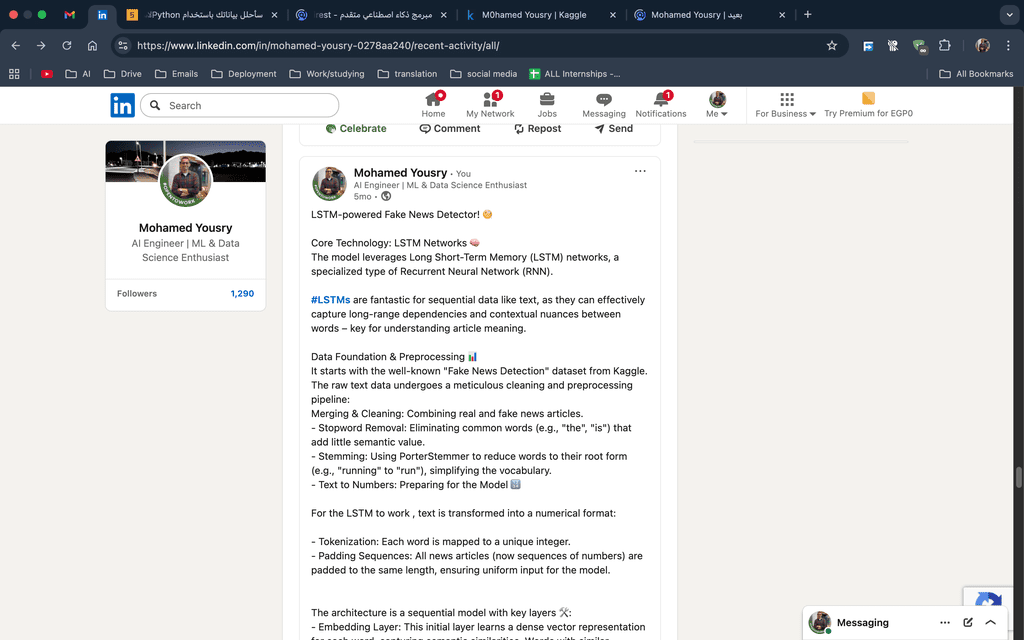 أطوّر نماذج لتحليل المشاعر، تصنيف النصوص، وكشف الأخبار المزيفة باستخدام تقنيات مثل Word Embeddings وLSTM وTransformers.