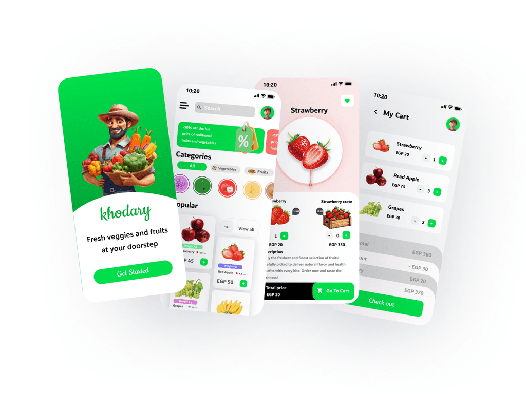 Khodary – تطبيق توصيل خضروات: تصميم تجربة كاملة من شاشة الترحيب حتى تتبع الطلب.