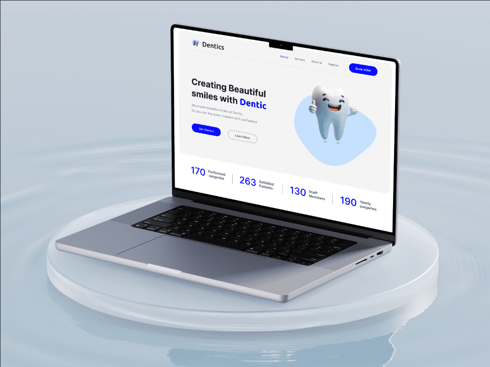Dentics – موقع عيادة أسنان: موقع متجاوب يعرض الخدمات ونظام الحجز وأقسام الأطباء.