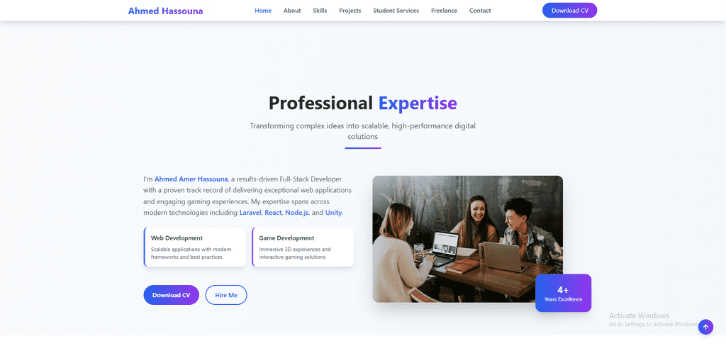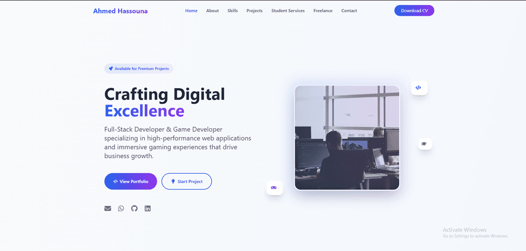 مرحبًا، أنا أحمد عامر حسونة، مطور برمجيات محترف بخبرة واسعة تتجاوز عدة سنوات في تطوير البرمجيات، المواقع، تطبيقات الويب، والتطبيقات التفاعلية، بالإضافة إلى تطوير الألعاب باستخدام Unity. أعمل بلغات Java, PHP, Python, JavaScript، وأتقن استخدام أطر العمل الحديثة مثل Spring Boot, Laravel, Angular, React، وأملك خبرة في قواعد البيانات MySQL وPostgreSQL وربطها بأنظمة التوثيق الحديثة مثل Laravel Sanctum.