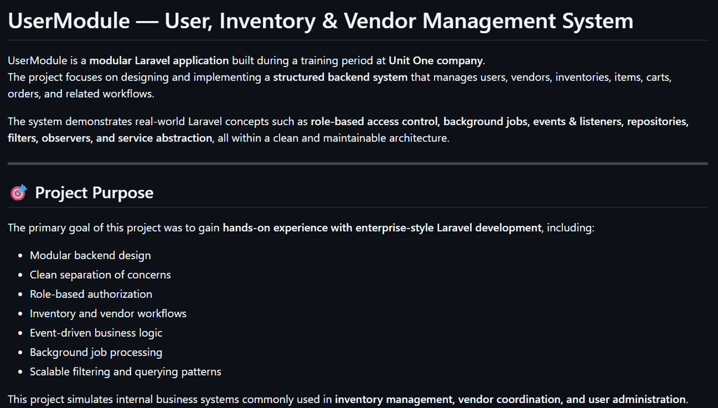 أعمل على بناء أنظمة قابلة للتوسع، آمنة، وسهلة الصيانة، مع اهتمام كبير بجودة الكود، وتنظيم المعمارية، وجاهزية النظام للاستخدام الفعلي في بيئات الإنتاج.