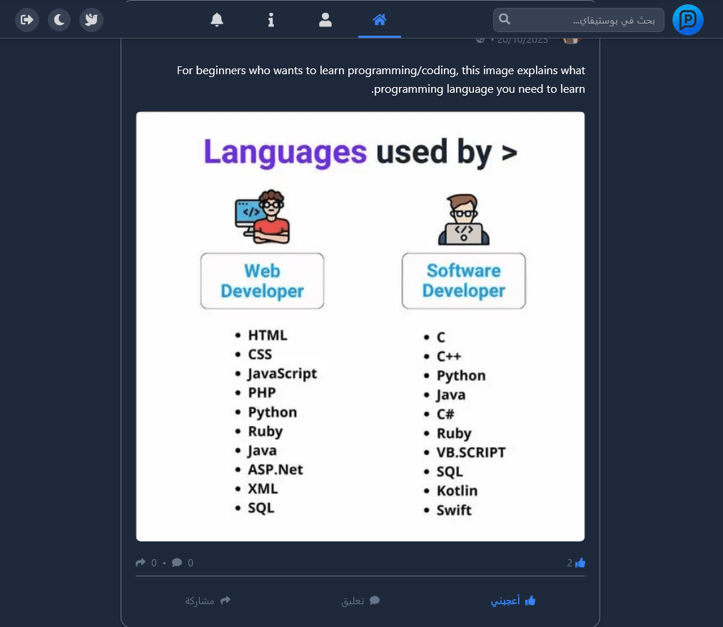 برمجة تطبيق Postify مشابه لـ Facebook، يتضمن نظام نشر وتفاعل (إعجابات – تعليقات – مشاركات – ردود)، وصفحات شخصية (Profile Page).