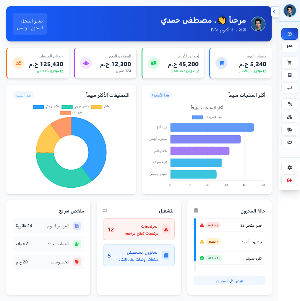 تطوير نظام POS متكامل لإدارة متاجر الملابس يضم التقارير والموردين والأصناف (CRUD) ولوحة تحكم باستخدام Firebase.