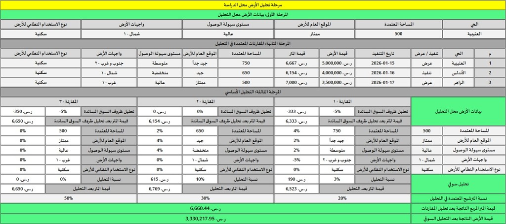 تحليل المسطحات وتوزيع الاستخدامات (سكني / تجاري) واحتساب النسب المؤثرة على القيمة.