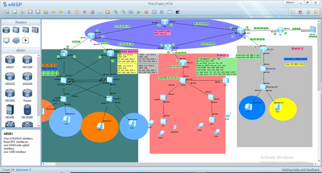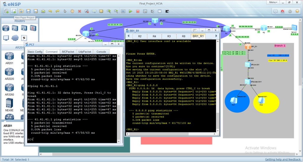 عملت على مشروع لتصميم شبكة Enterprise كاملة تشمل أقسام متعددة، مع إعداد الـRouting والـVLANs وربط الفروع ببعض باستخدام تقنيات مختلفة.