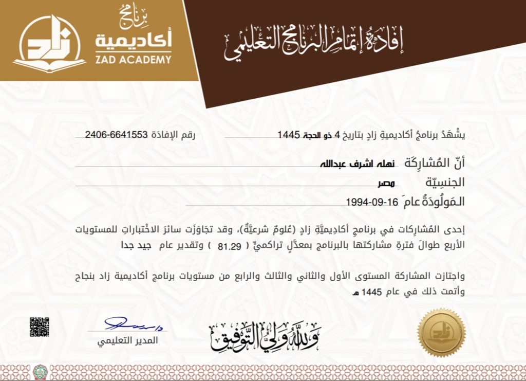 Diploma in Islamic Sharia from Zad Academy, Saudi Arabia