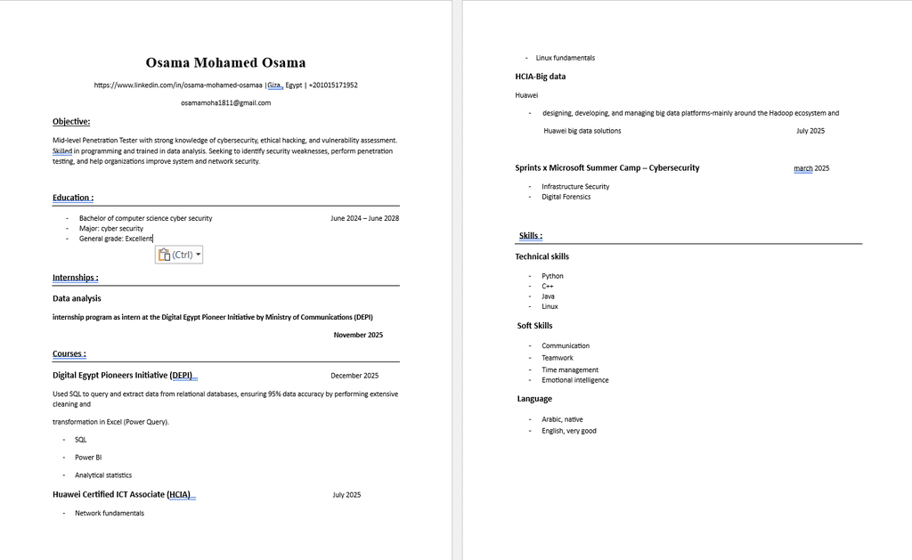 طالب في السنة الثانية تخصص الأمن السيبراني، أركز على دراسة أسس تكنولوجيا المعلومات، أمن الشبكات، والبرمجة، بتقدير عام ممتاز. (تاريخ التخرج المتوقع: يونيو 2028)