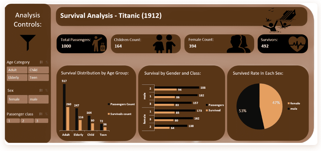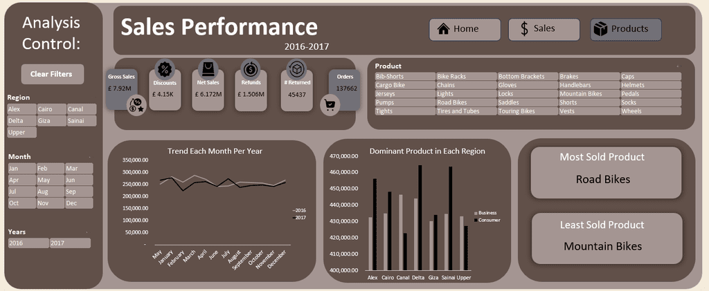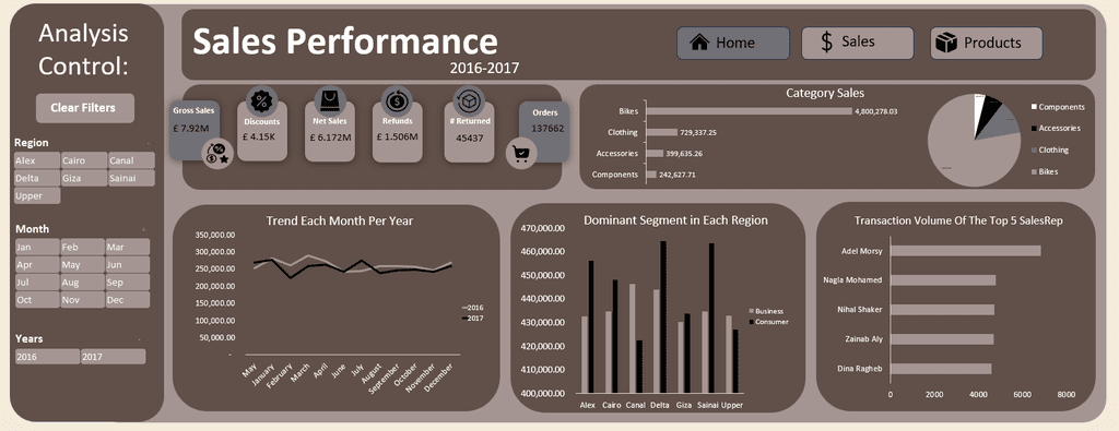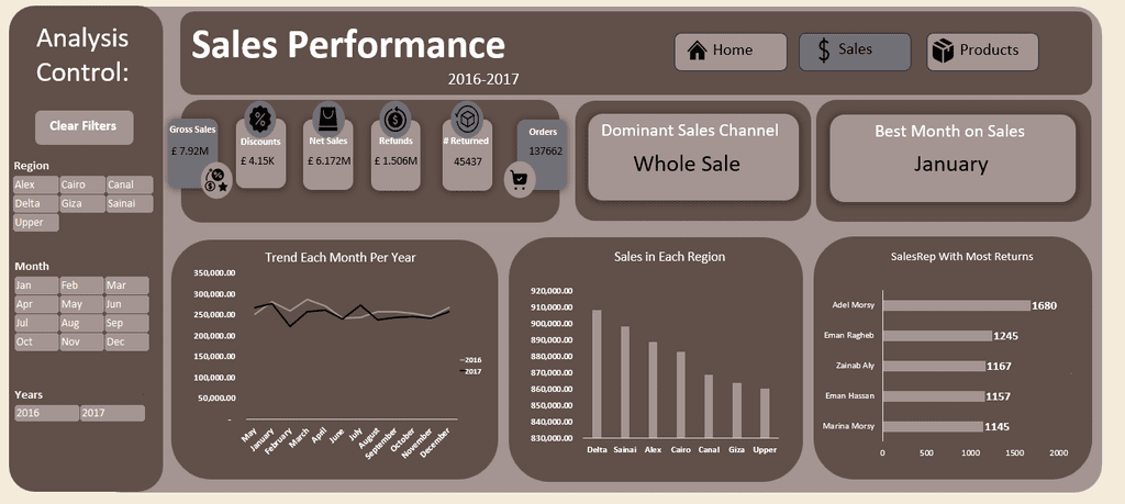 وبما إن الناس عادةً مش بتركّز على جداول البيانات الطويلة والمعقدة، فأنا بستخدم Interactive Dashboards لتحويل الأرقام إلى صورة أوضح وملخص بصري سهل الفهم. أي مستخدم يقدر يختار الجزء اللي يهمه من البيانات بسهولة باستخدام Slicers والفلاتر. كمان بضيف Tabs لكل جانب محدد من التحليل، بحيث كل Tab يوضح زاوية مختلفة من البيانات.
