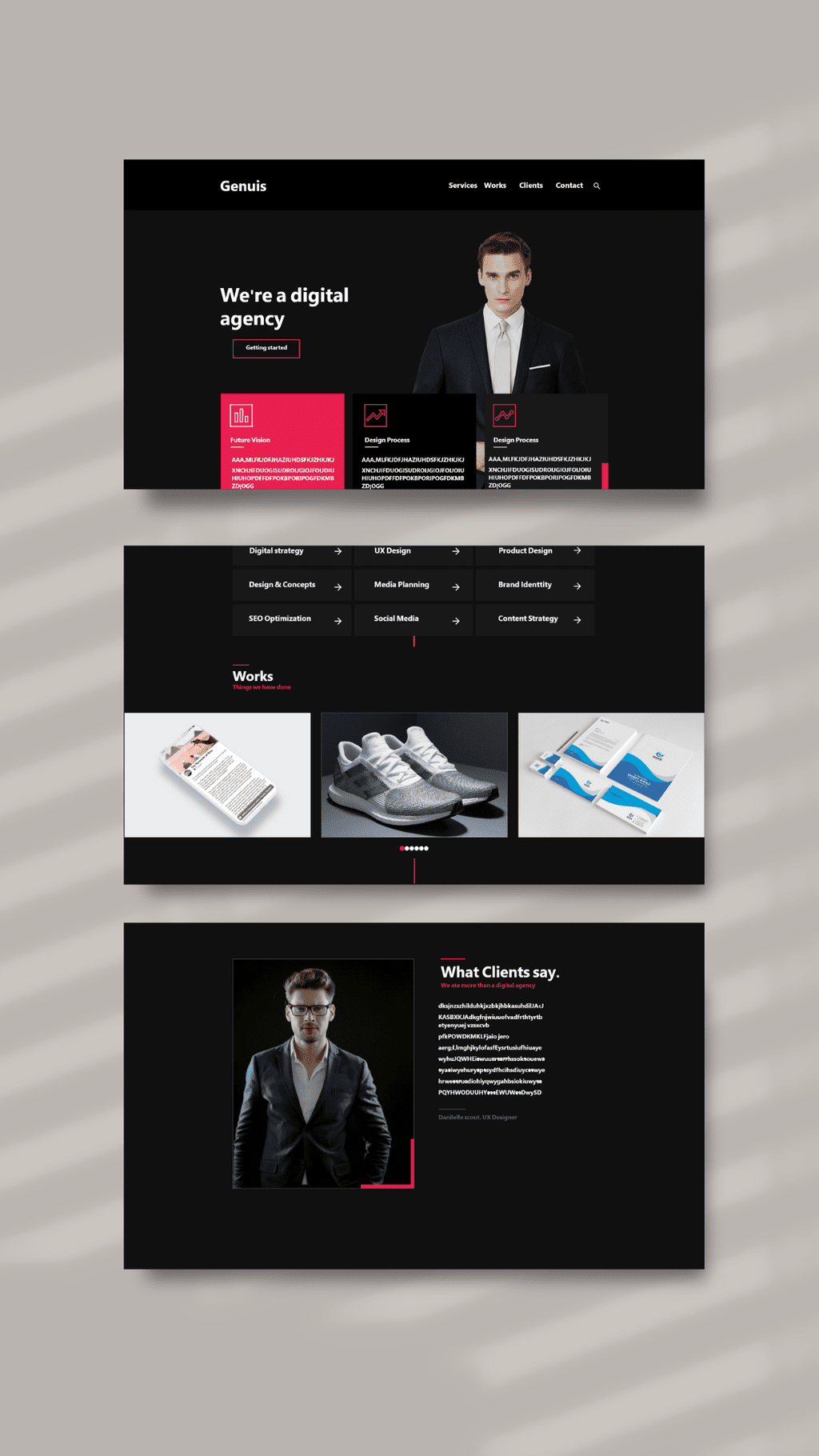 التصميم يركز على إبراز الخدمات، الأعمال السابقة، وآراء العملاء بأسلوب بسيط وواضح يعزز الثقة والمصداقية.