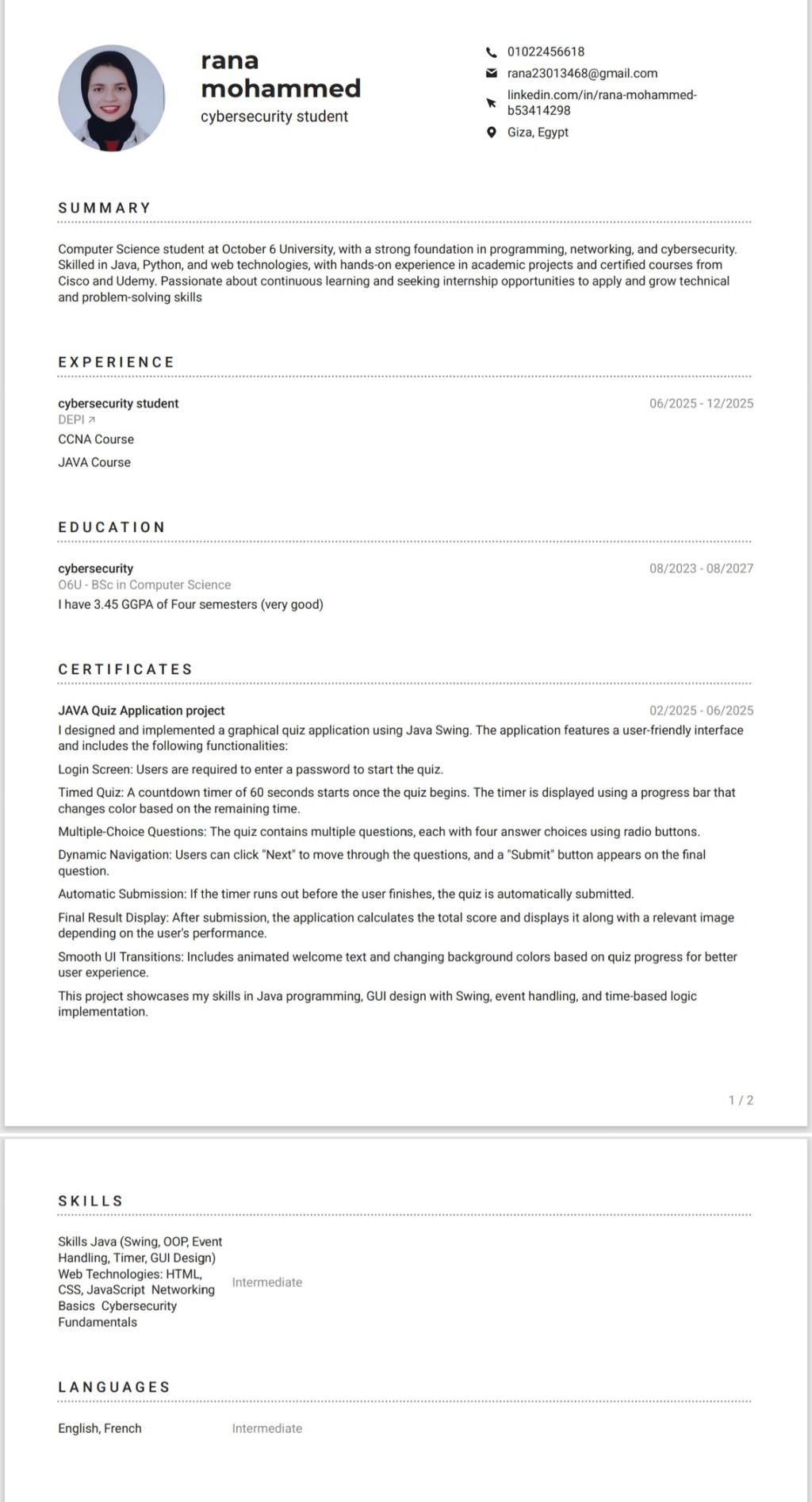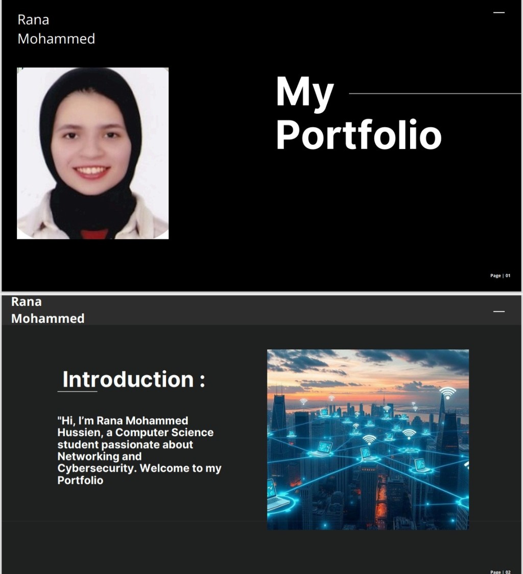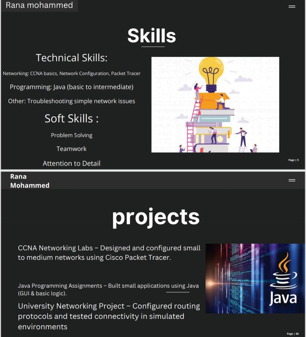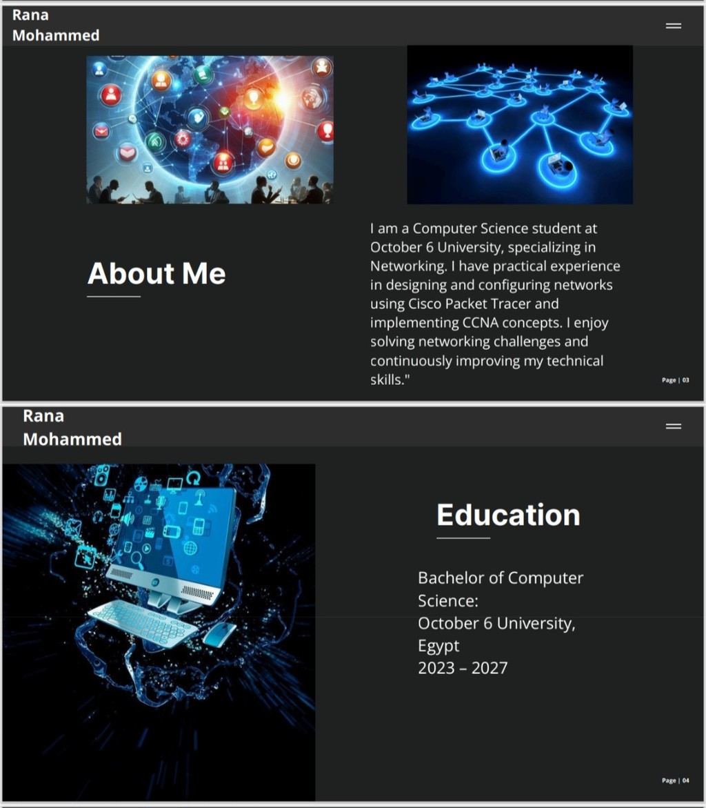 أنا رنا محمد حسين، طالبة في كلية الحاسبات والمعلومات – جامعة 6 أكتوبر، شغوفة بمجال الشبكات وعلوم الحاسوب وأسعى دائمًا لتطوير مهاراتي التقنية والأكاديمية. لدي اهتمام خاص بتقنيات Cisco Networking وحاصلة على تدريب وشهادة إتمام مستوى من برنامج CCNA، مما منحني معرفة عملية بأساسيات الشبكات، تصميم البنى التحتية، وإعداد وتكوين الأجهزة مثل الراوترات والسويتشات.