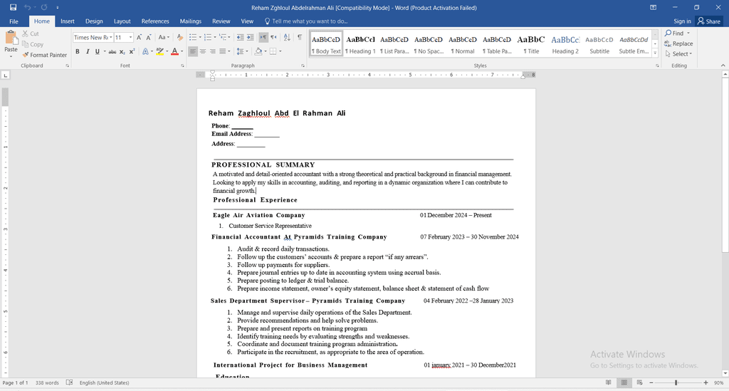 محاسبة تتمتع بخبرة عملية في إعداد التقارير المالية والتدقيق وإدارة الأنظمة المحاسبية (ERP). لديّ قدرة عالية على تحليل البيانات المالية وإعداد القوائم والتقارير بدقة، بالإضافة إلى المساهمة في تطوير الأنظمة المحاسبية وتحسين الأداء المالي. أسعى لتوظيف مهاراتي المحاسبية والإدارية لدعم نجاح المؤسسات وتحقيق أهدافها المالية بكفاءة واحترافية.