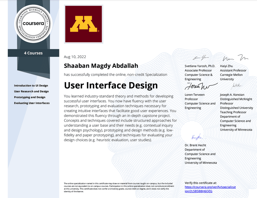 - **User Interface Design Specialization** – جامعة مينيسوتا (University of Minnesota)